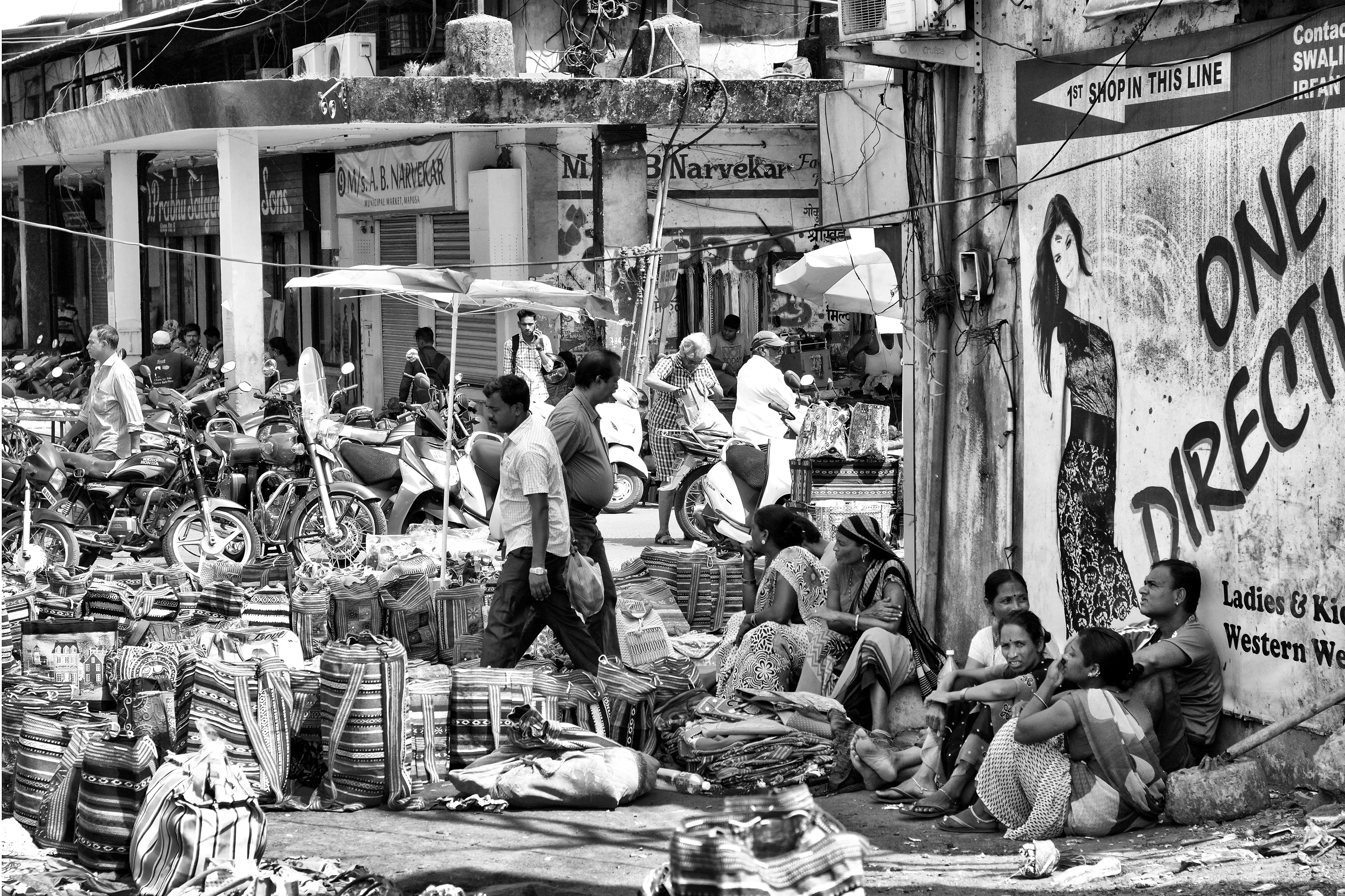 Framed at the Mapusa Street market, Goa, India..